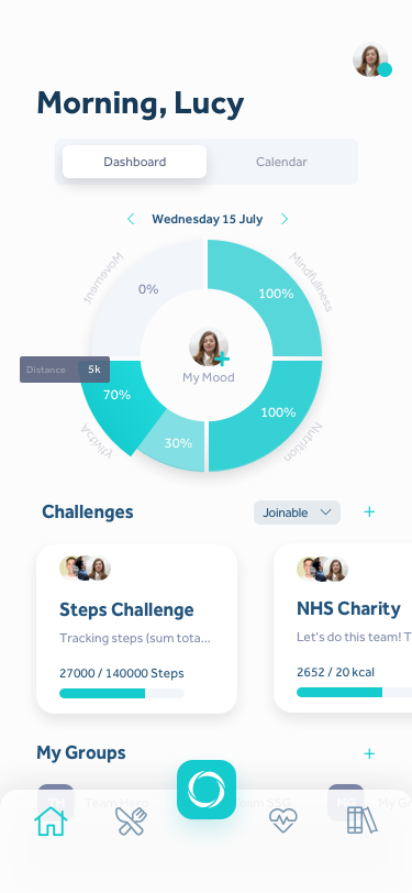 We redesigned the primary data visualisation on the dashboard to clearly indicate to users the component parts of holistic wellbeing and how they were progressing towards their daily goals. We also chose to revamp the IA and set about surfacing the most meaningful content to the user on the dashboard such as Current Challenges and Groups.